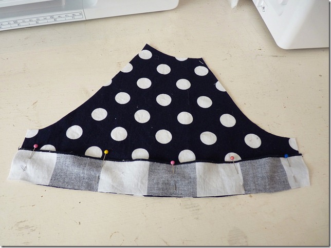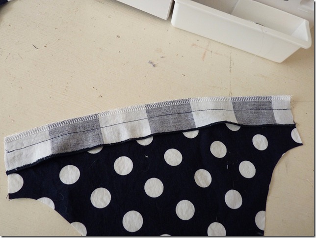 Now, press you seam allowance toward the sleeve (dotted fabric), and topstitch at the edge of your seam finish. Again, maintain at least 1/4” casing next to your seam. You can see the two rows of navy thread in my photo below.